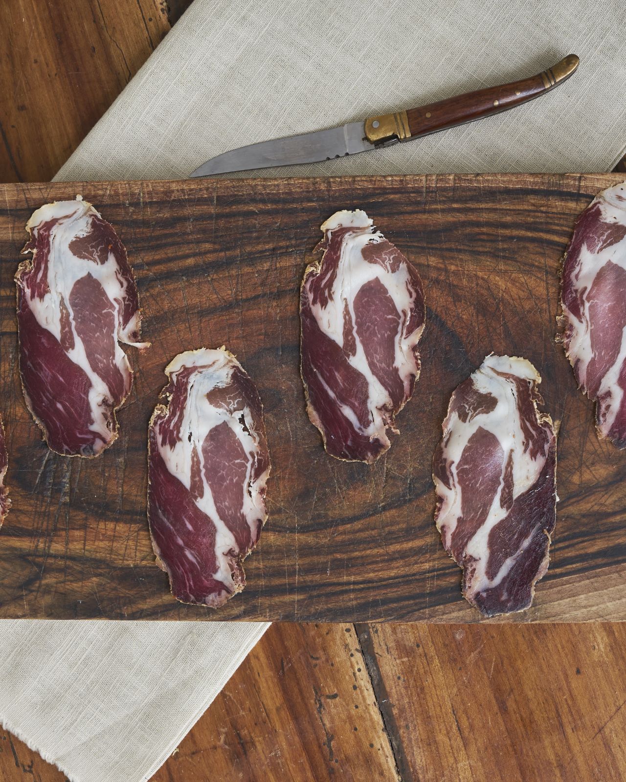 Découpe : Découpez la coppa à froid, à peine sortie du frigo. Cela assurera une bonne tenue de la pièce. Découpez de fines tranches que vous disposerez sur une assiette plate et tiède, laissez-les s’imprégner de la température ambiante.