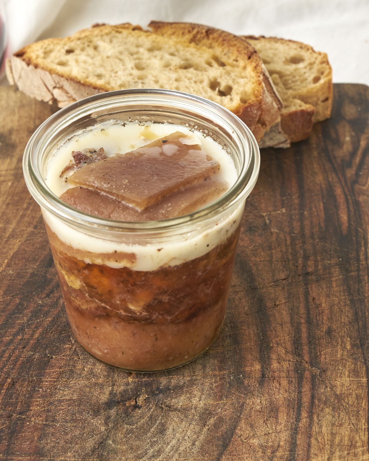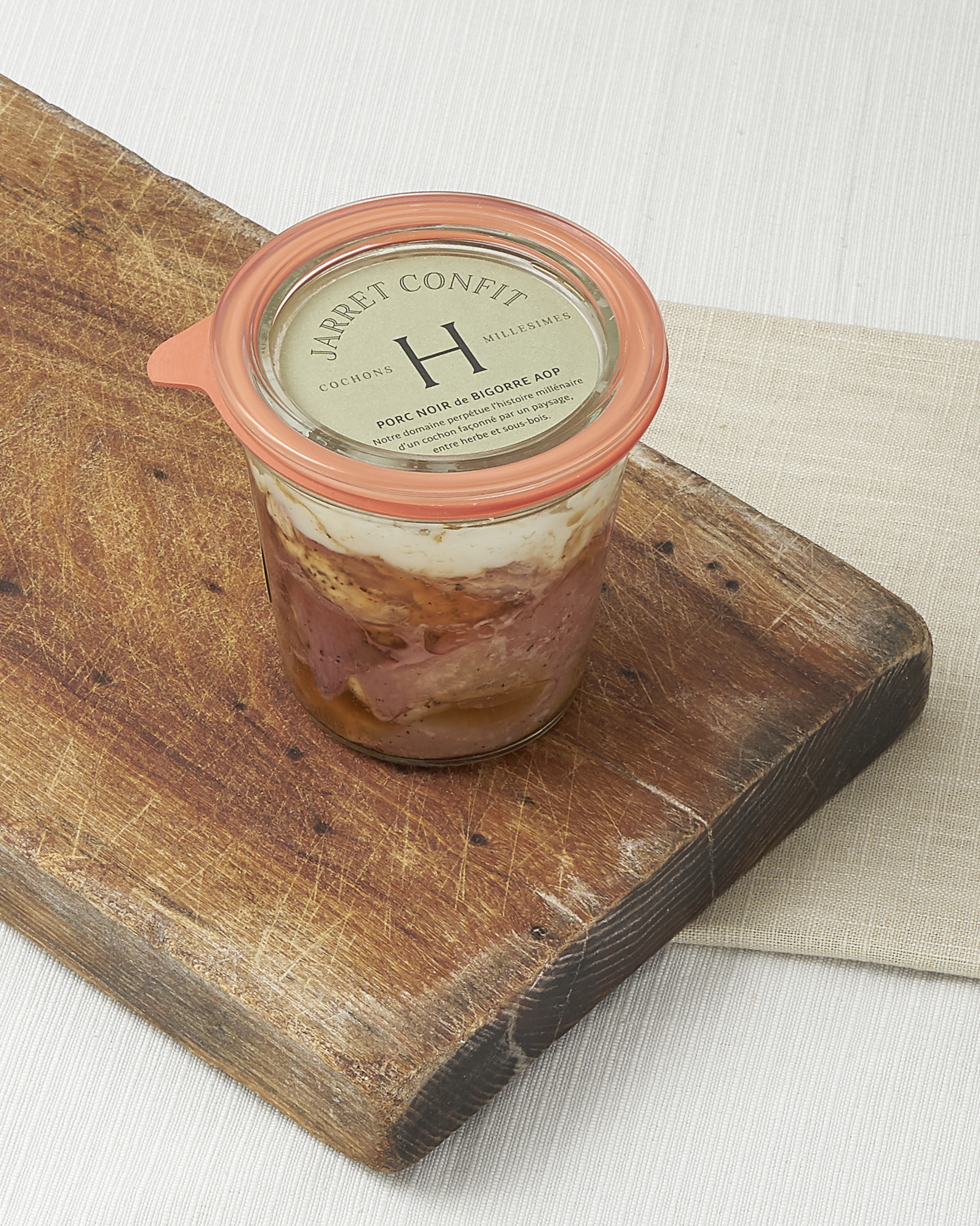 Dégustation : Il est important de déguster le confit de jarret à température ambiante pour que tous ses arômes s’expriment. A déguster comme une terrine sur un pain frais ou en entrée accompagné d’une salade.