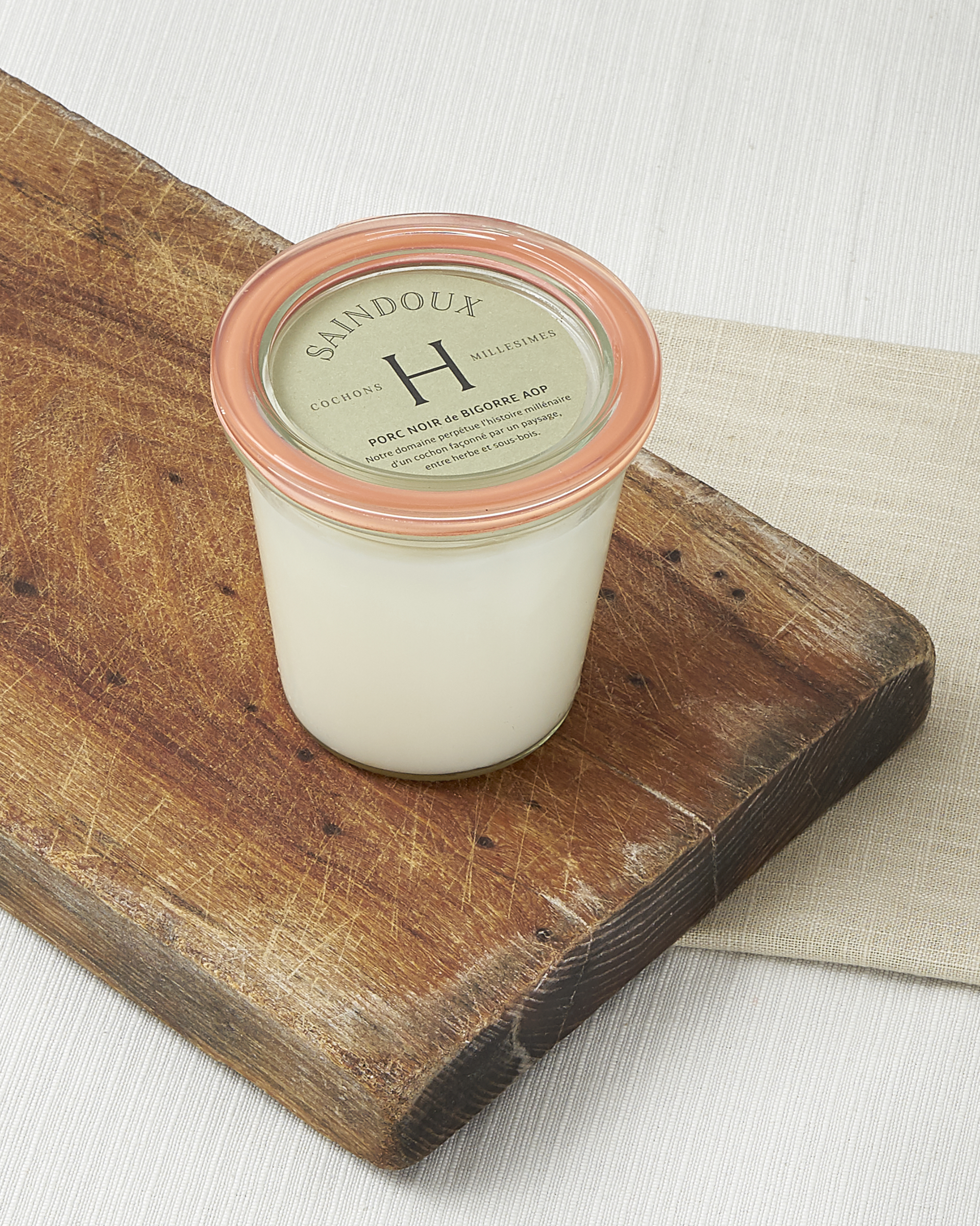 Notre saindoux est d’un blanc immaculé, il a l’onctuosité d’une crème fraîchement battue et la tenue d’un beurre de baratte.